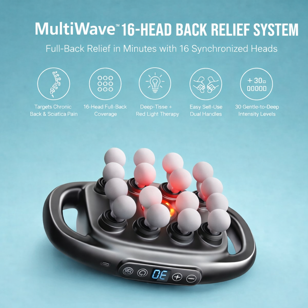 Transform your daily relief with MultiWave™, the revolutionary16-in-1 Synchronized Coverage System. Combining16 synchronized massage heads,red light therapy, and30 precision intensity levels, it redefines what's possible in at-home pain treatment. Users praise its ability toeliminate the 40-minute chase,restore complete mobility, anddeliver true independence, making it a must-have for anyone who's tired of partial relief from single-head limitations.MultiWave™ isn't just another massage gun; it's a commitment to complete coverage,restored self-sufficiency, and getting your whole back treated at once.